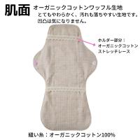 夜用布ナプキン(縦長さ約29cm)お肌側から、オーガニックコットン・吸収体生地3層(内部)・透湿性防水布(内部)・コットンの6層構造です。長めで夜も安心。肌面はオーガニックコットンのワッフル生地になります。凹凸は気になりません。肌触りの良い生地です。布パッドやハンカチタイプの布ナプキンをホルダー部分に挟むと厚みが増します。布パッド無しでご使用の際は、ホルダー部分(レース)を柄の方の生地にひっくり返してご使用ください。<素材>柄の布地:コットンベージュ色の布地:オーガニックコットン内部:オーガニックコットンフランネル・透湿性防水布糸:オーガニックコットン糸レース:オーガニックコットンレース プラスチックスナップ<サイズ>夜用 縦:約29m/横:最大約17cm(羽部分)*写真と色が違う場合もございます。また、裁断箇所により柄の出方が異なる場合がございます。ご了承くださいませ。