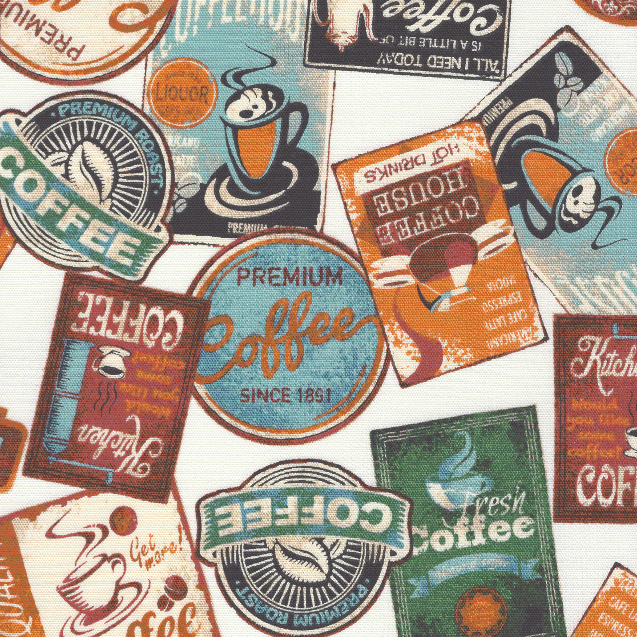 FUWARI 染布 オックス Cafe Sign カフェ看板 アイボリー系地 4色 1m単位 生地 布 布地 コーヒー 看板 レトロ コーヒーカップ 柄 英字 アルファベット