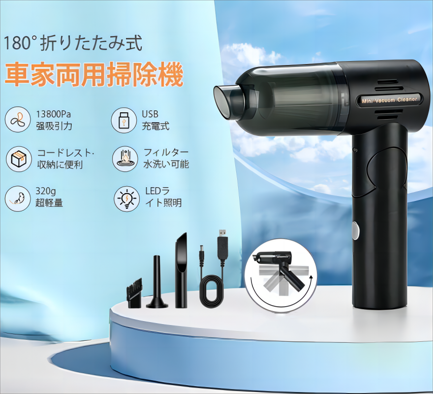 ハンディクリーナー 車載掃除機 コードレス USB 充電式 180°折りたたみ式 乾湿両用 ハンディ掃除機 卓上クリーナーLEDライト付き 軽量 多機能ミニ掃除機 2-in-1