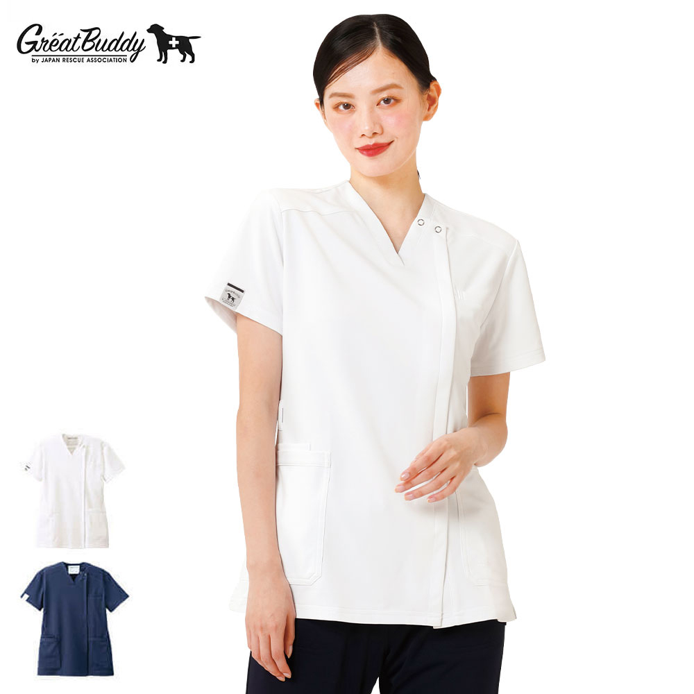医療 ナース 看護 白衣 ユニフォーム 女性 レディース 吸汗速乾 白 シンプル 犬 前開き グレートバディ アスレフィットストレッチスクラブ