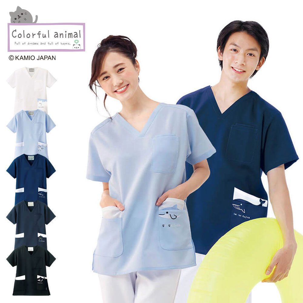 医療 ナース 看護 白衣 ユニフォーム 半袖 男女兼用 可愛い イルカ ペンギン カラフルアニマル 海のスクラブ(男女兼用)