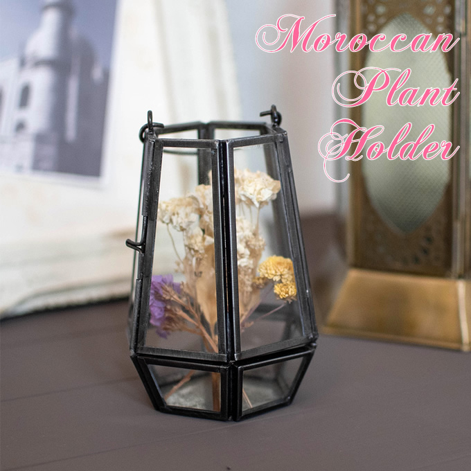 | シンプルモダンなヘキサゴンの形状が特徴的なプラントホルダー。 フレームで縁取られたガラス面がたくさんあり、オリエンタルな雰囲気が漂います。 フォトジェニックなプラントホルダーでお部屋をモロッカンスタイルに。 植物をそのまま飾るのも素敵ですが、プランツホルダーに入れるだけでお洒落なSHOP風インテリアに。 エアープランツやドライフラワーを飾れば、ちょっぴり幻想的な空間を演出してくれます。 テーブルや棚に置くだけでなく、ハンドル付きなので吊るしても飾れます。 雑貨などを入れてディプレイするのもおすすめです。 |