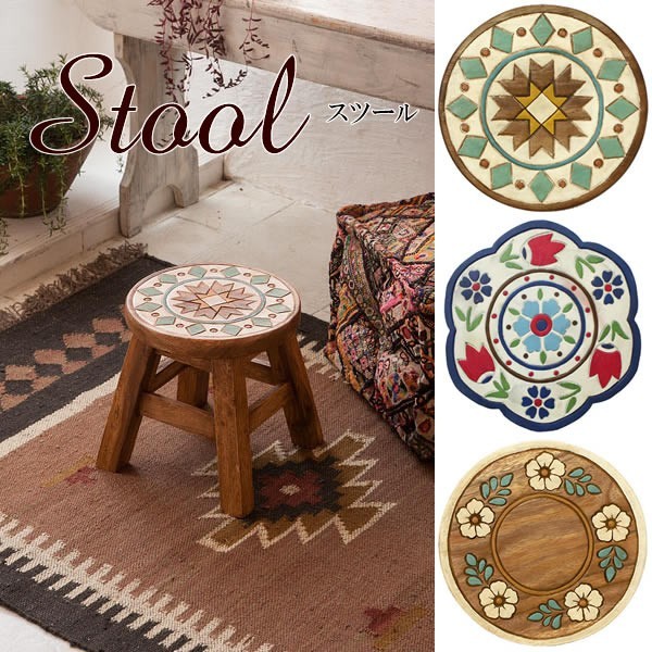 | 材質は木目のきれいなアカシア製。 木のぬくもりを感じるウッドスツールです。 柄の部分は木彫りをし、柄を浮き立たせている為、 普通のペイントものよりも断然おしゃれで存在感があります。 足元はウッドカラーそのままなので、ナチュラル感も損なわれません。 |