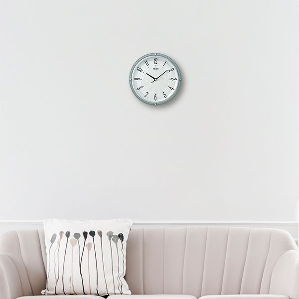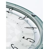 | 枠材 | プラスチック枠(薄青塗装)、前面:ガラス | | サイズ・重さ | 直径330×50mm | | 電池 | 単3(アルカリ)×2、(電池寿命約2年間) | | 機能 | ・電波修正機能(40kHz/60kHz自動選局・受信OFF機能つき) ・電池切れ予告機能(秒針停止) ・スイープセコンド ・おやすみ秒針(光センサーによる自動秒針停止機能) ・スワロフスキークリスタル使用 | |