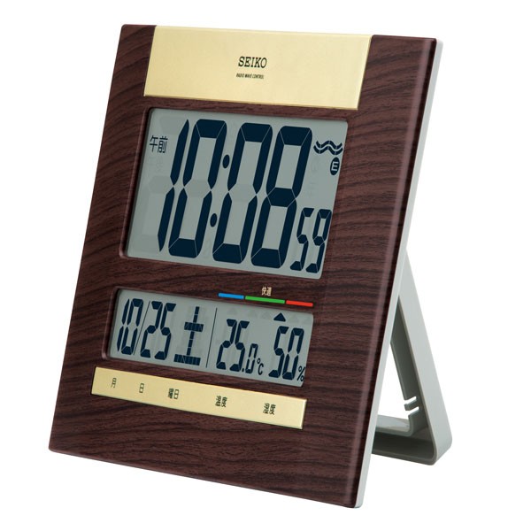 | 木目模様で高級感のある、薄型設計の掛置兼用クロック。 温湿度表示に加え、快適度表示が健康管理を応援。 枠材=プラスチック枠 、前面:ガラス サイズ・重さ=180x260x22mm 470g、174x260x81mm置いた状態 電池=単3(マンガン)×2、(電池寿命約1年間) 機能=電波修正機能(40kHz/60kHz自動選局・受信OFF機能つき)、2099年までのフルオートカレンダー機能、温湿度表示(温度測定範囲:0℃〜40℃ 測定精度:±2℃ 湿度測定範囲:25%RH〜85%RH 測定精度:±8%(25℃))、快適度表示(6段階)、12時間制/24時間制切替式、置用スタンドつき セイコーの目覚まし時計を全部見る>> |