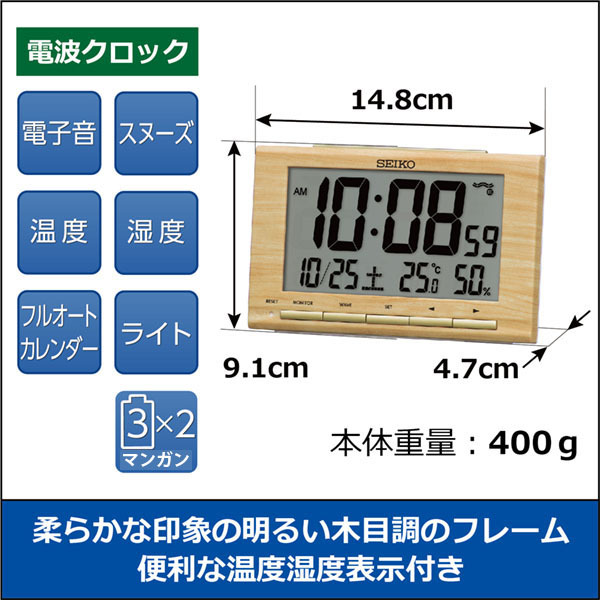 目覚まし時計 セイコー SEIKO 置き時計 SQ799B 電波時計 デジタル カレンダー 温度計 湿度計 オシャレ おしゃれ 名入れ可 記念品 延長保証