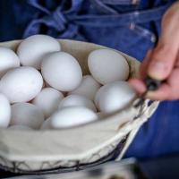 2.新鮮な卵。毎日1時間半かけて1500個の卵の卵割り。工房近くにある養鶏場の産みたて新鮮な卵がバーギズのおいしさの理由。鶏がリラックスするように24時間音楽をかけ、徹底した清掃を頻繁に行うことにより鶏舎には鶏特有の匂いもなく清潔です。