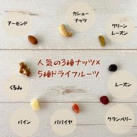 素焼きアーモンド、素焼きカシューナッツ、生くるみの人気3種ナッツに、レーズン、グリーンレーズン、パイン、パパイヤ、クランベリーの5種ドライフルーツをミックスしました