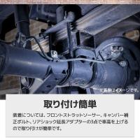 車種により若干構造や付属品は違いますが基本はフロントストラットソーサー、キャンバー補正ボルト、リアショック延長アダプターの3点で車高を上げますので取り付けが簡単で、純正ショック&スプリングのストロークを活かし乗り心地変化が少ないのが特徴です。