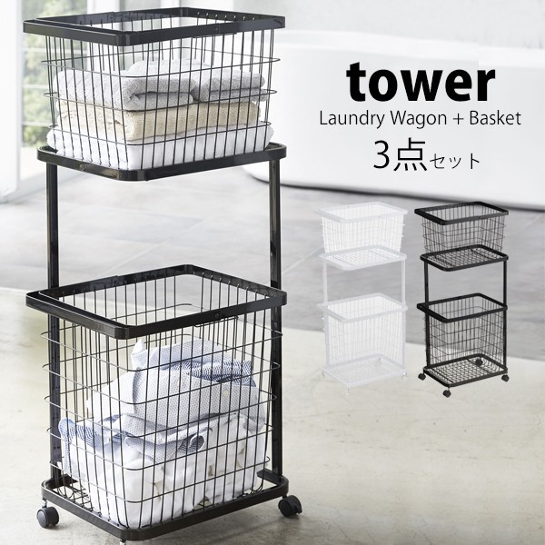 タワー 山崎実業 tower ランドリーラック ランドリーバスケット 2段 ランドリーワゴン+バスケット 洗濯物 かご キャスター 洗濯かご スリム おしゃれ 3点セット