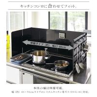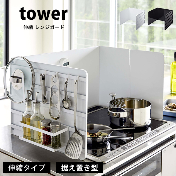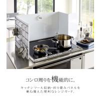 | キッチンツールの収納も兼ね備えた「伸縮レンジガード」のご紹介です。 サイドパネルは料理中のプチストレスを解消できるように半分だけ折りたためる仕様に。 反対側はキッチンツールを収納できる便利なフック付きのスペースに。 |