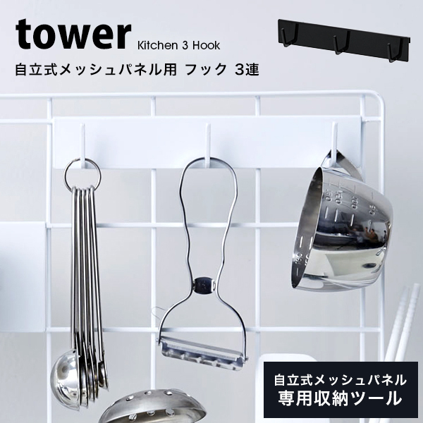 タワー 山崎実業 キッチン用品 便利 キッチン 自立式 メッシュパネル用 フック 3連 tower 収納 おしゃれ フック 引っ掛け 整理 白 黒 ホワイト ブラック
