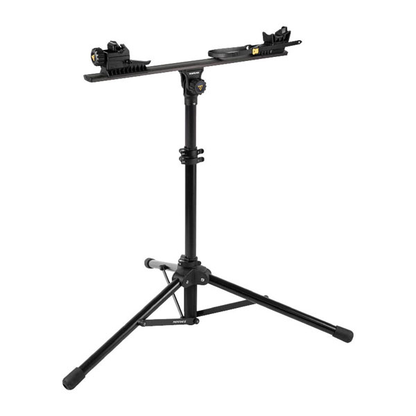 フロントフォークのアクスル部とボトムブラケット部で車体を固定するリペアスタンド。高さや角度の調節に加えて、重心の位置調節や 360°回転も可能。