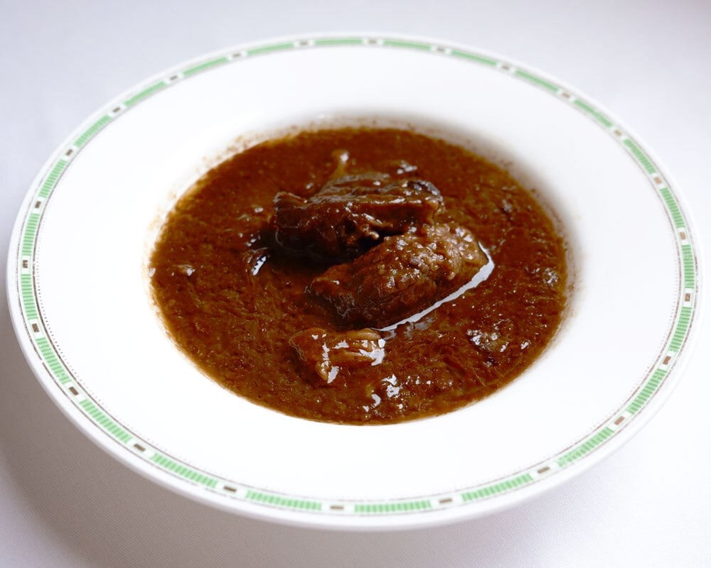 特別にカットした大きな塊肉をじっくりと煮込むことで非常に柔らかく、口の中で繊維がゆっくりとほどけます。それは外国産の牛では味わえない、繊細な赤身にきめ細やかなサシが入った松阪牛だからこその優雅な口当たりです。