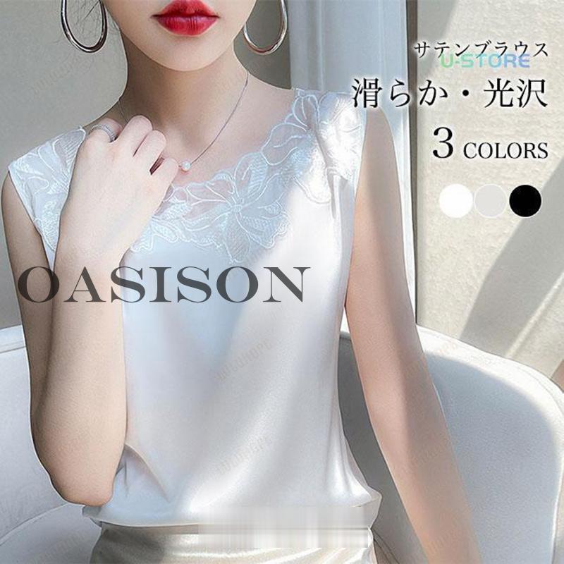 ブラウス ノースリーブ サテン レディース タンクトップ レースブラウス 袖なし 夏 サテンブラウス 滑らか 光沢 軽薄 トップス レース襟 レトロ