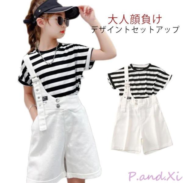 韓国子ども服 2点セット 韓国子供服 韓国こども服 tシャツ サロペットパンツ サロペットワイド パンツ ストライプ柄 キッズ カジュアル 夏 女の
