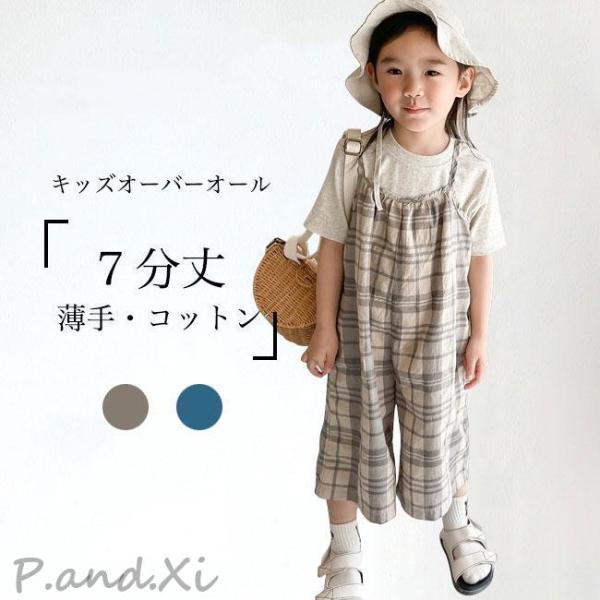 女の子 オーバーオール 綿混 薄手 夏 女児 オールインワン チェック柄 サロペット 7分丈パンツ コットン キッズ サロペットパンツ ゆったり