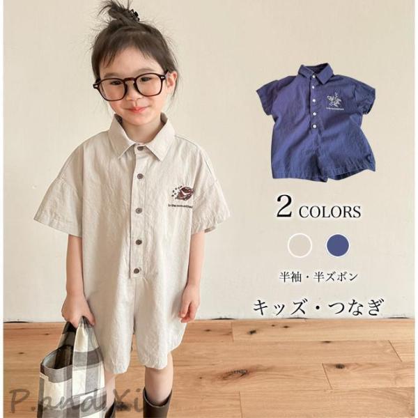 つなぎ 女の子 半袖 夏 コンビネゾン ゆったり 半ズボン キッズ オールインワン 刺しゅういり ショートパンツ 半袖つなぎ お洒落 薄手