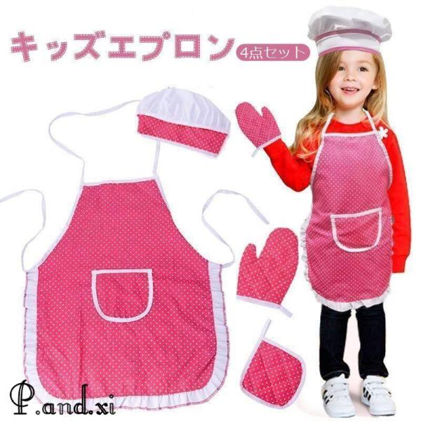 キッズエプロン ハット ミトン 鍋敷き 4点セット 子供用 クッキング ドット柄 水玉模様 前掛け シェフハット かわいい