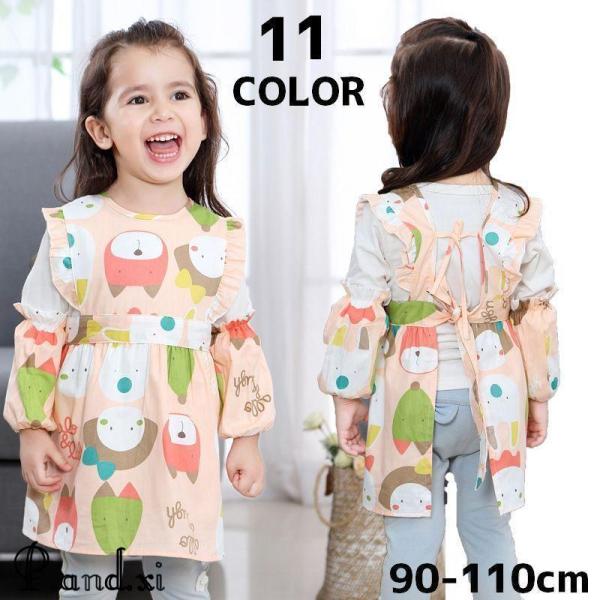 エプロン キッズ 子供 アームカバー 2点セット フリル リボン アニマル フラワー 紐 汚れ防止 キッチン用品 キッチングッズ 料理 実習 習い事