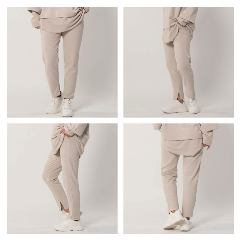 バックに左右ポケット付きのリラックスパンツ肌触りが気持ちよいゆったりとした着心地。裾に入ったスリットが脚長効果ですらっとした印象に。シンプルだからこそ素材とシルエットにこだわったデザインに。レイヤード風パーカー(品番:521010)とセットアップでコーディネートできます。