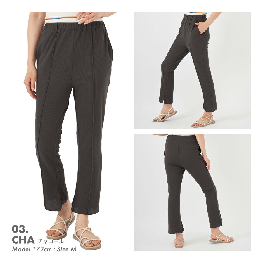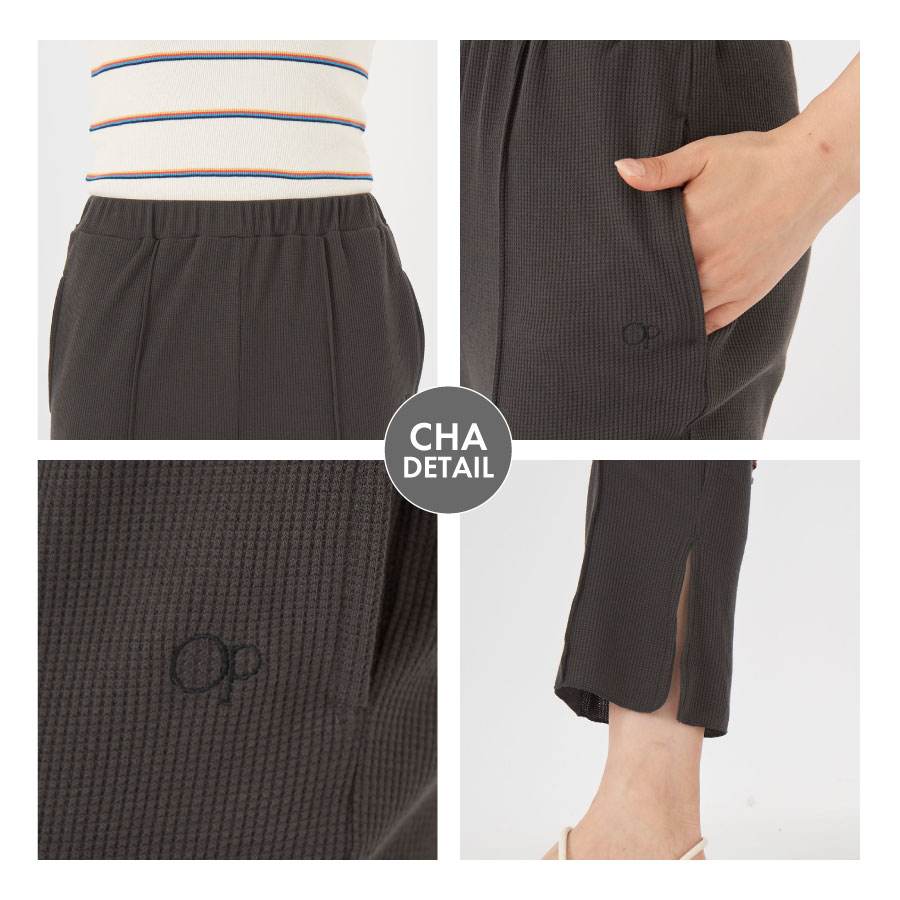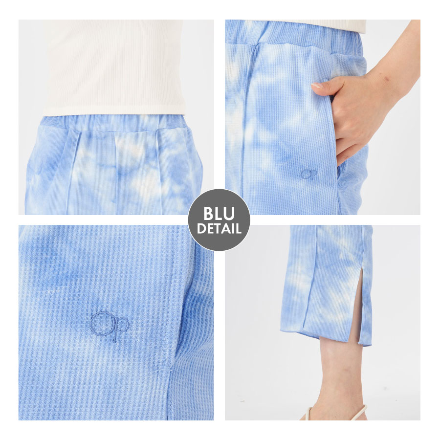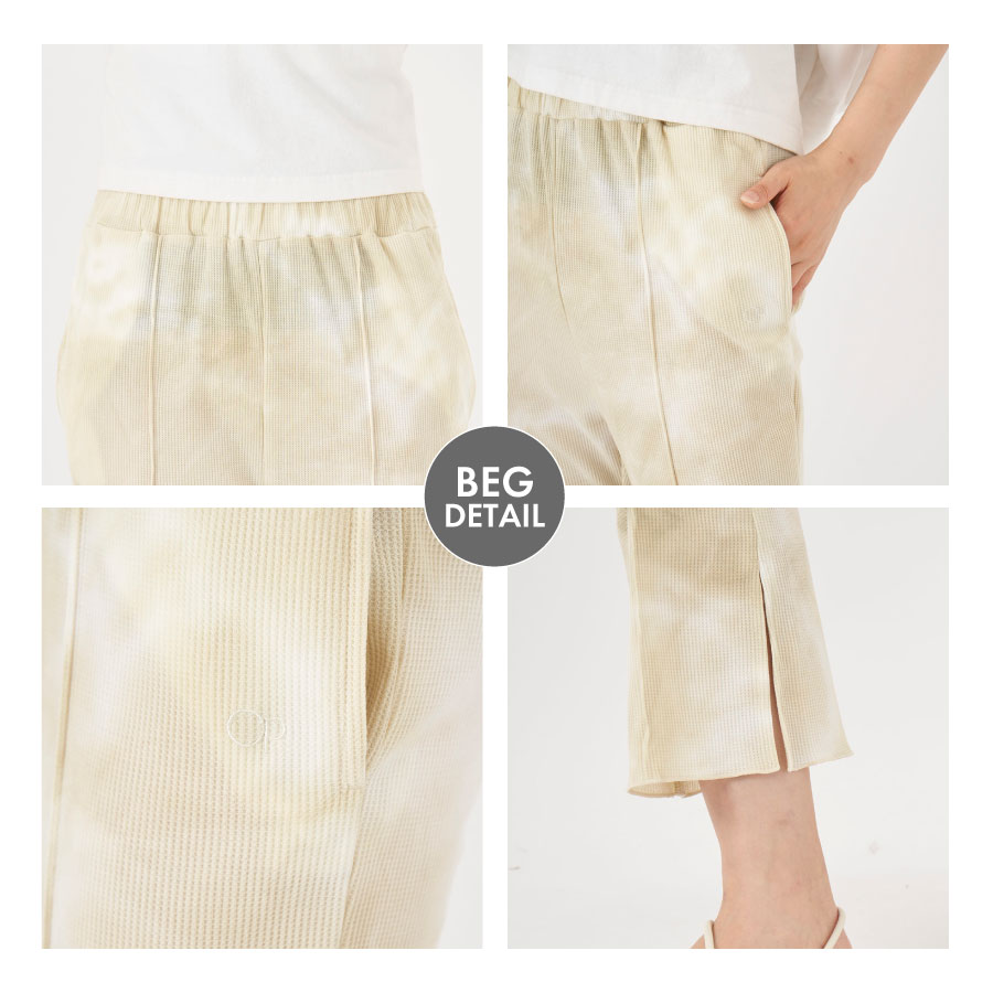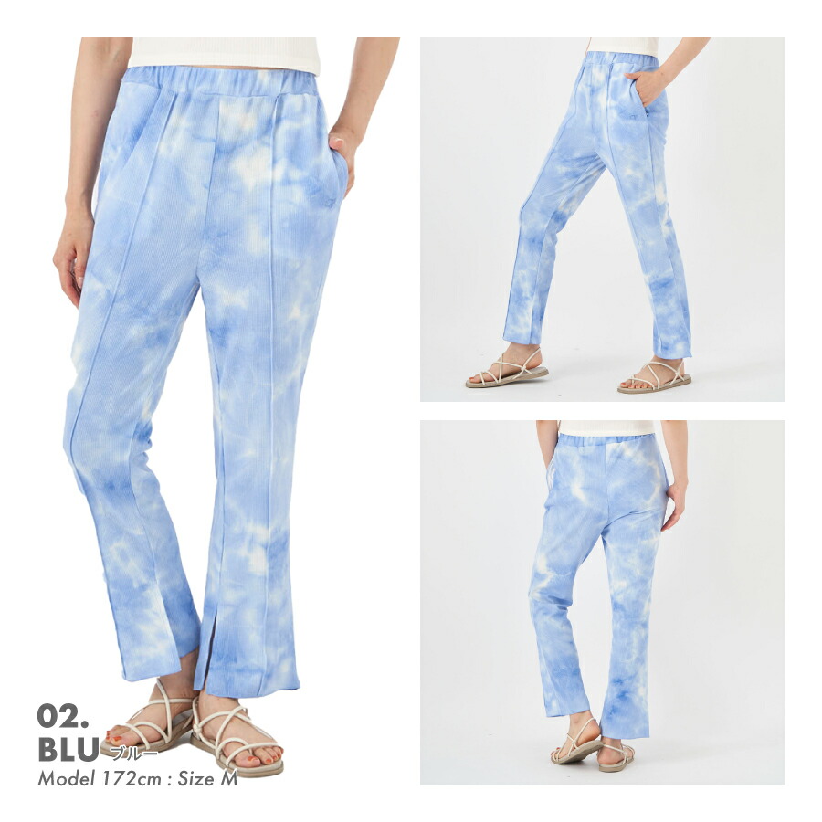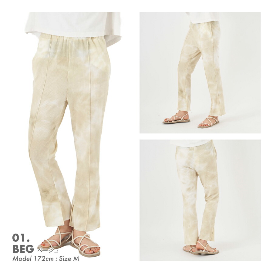 ワッフル生地にセンタープリーツを合わせ、カジュアルさの中にもきちんと感が出るロングパンツです。裾にスリットの入ったトレンドのデザイン。ウエストはゴムで楽ちん。夏に映えるタイダイ柄と、着回しの効く無地の2パターン。水にも入れるハイブリッド素材なので、普段着でも水回りのレジャーやフェスでも様々なシーンで着て頂けます。同素材のプルオーバー(品番:522487)もおすすめです。