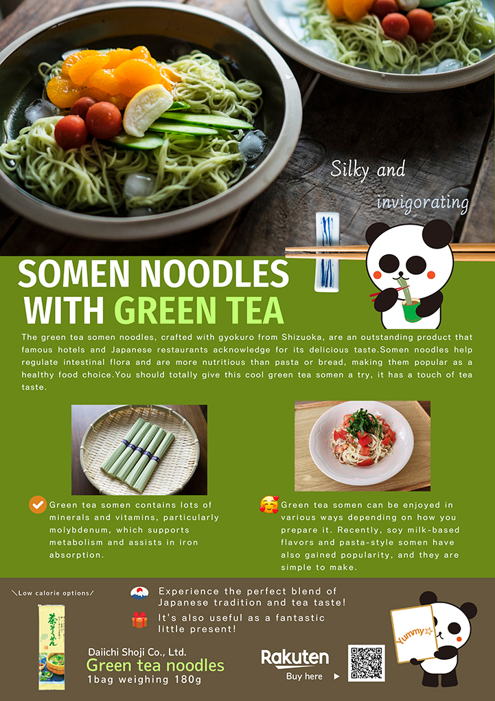 静岡のお茶畑から生まれた彩りと程よいコシ、のどごし爽やかな素麺です。