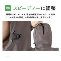 顔周りはドローコード、深さは後頭部のベルクロで簡単にフード周りを調節。防寒・防暑対策に素早く対応。