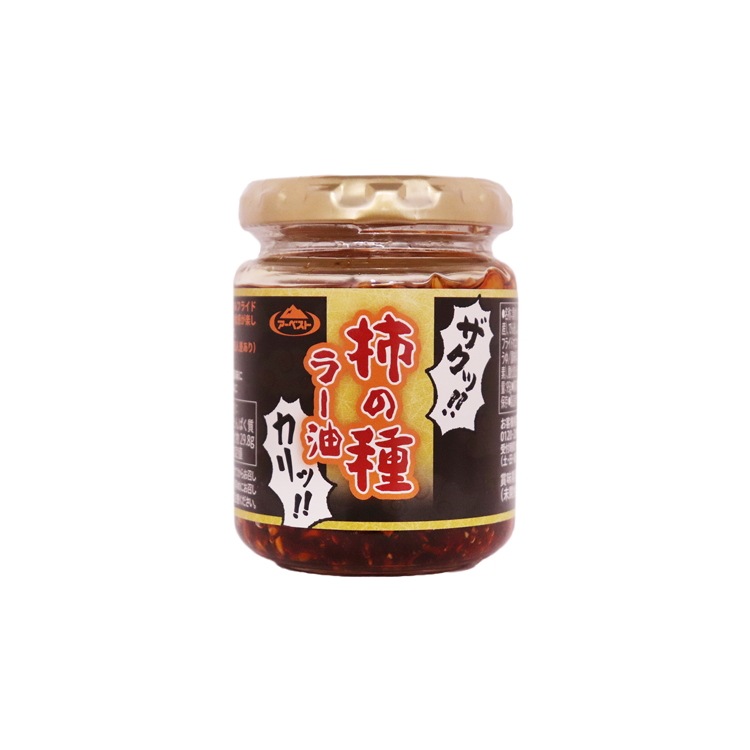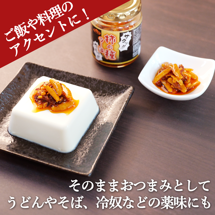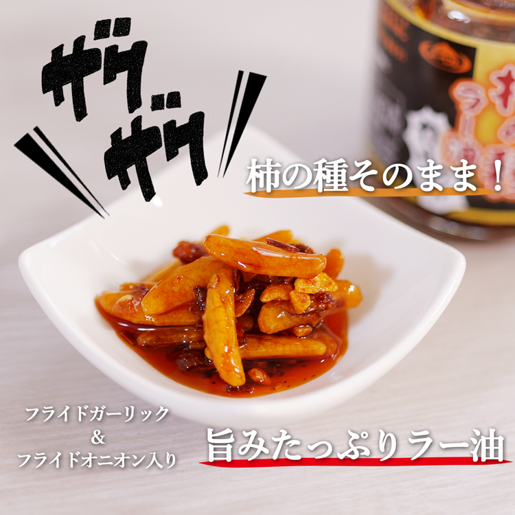 柿の種ラー油は、フライドガーリックとフライドオニオンが絶妙に組み合わさった、旨味たっぷり、食感豊かな具材入りラー油です。