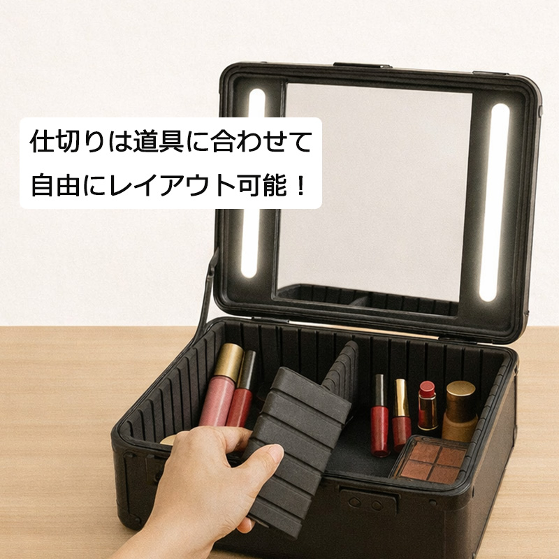 メイクボックス 鏡付き ライト付き 取っ手付き 大容量 持ち運び プロ用 プロ LED ライト 高級 ハード 鍵付き 女優鏡 仕切り自由 3色 コスメボックス おしゃれ