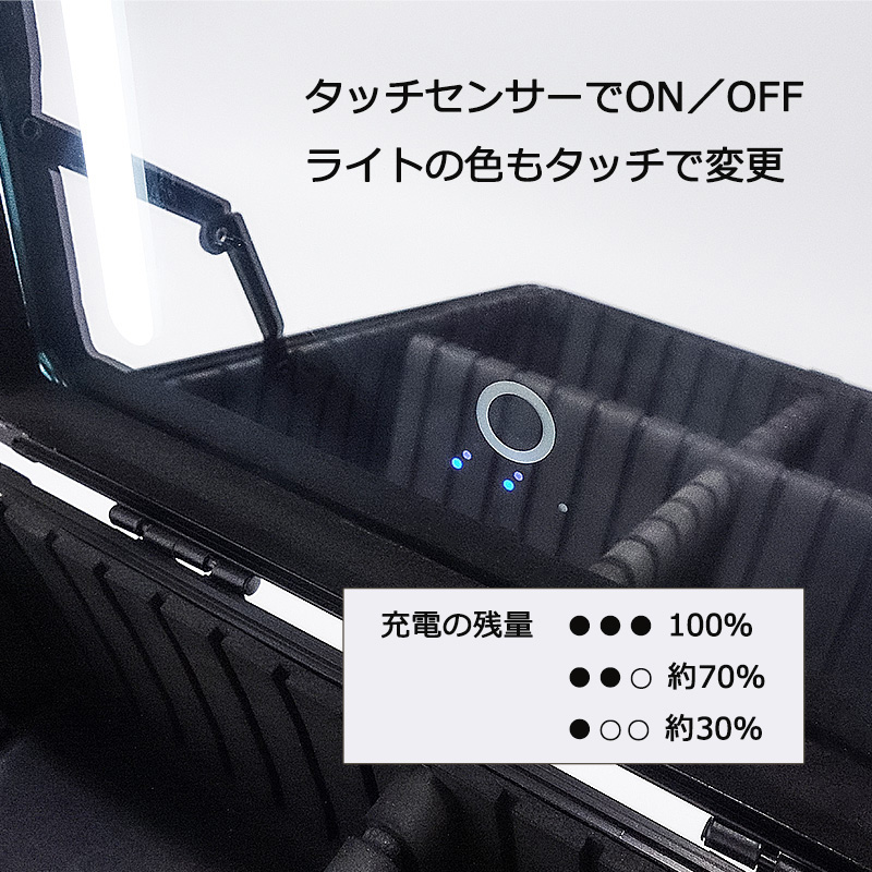 ・LEDライトはタッチセンサーでON/OFFはもちろん、3種類の色調モード選択、お好きな明るさへの無段階調節が可能で、メイクの仕上がりに差が出ます。
