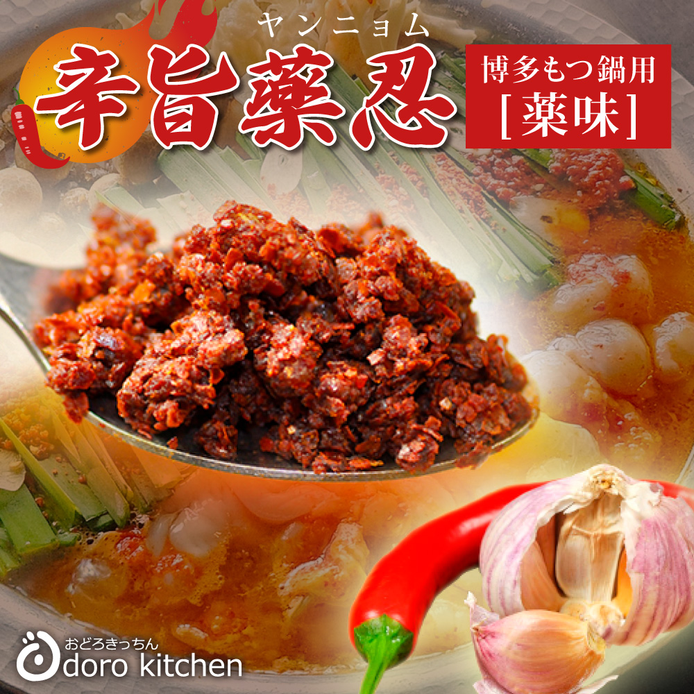 たっぷりの刻みニンニクとコチュカリ(粉胡椒)とコチュジャンを練り込んだ「特製の辛旨薬忍(ヤンニョン)」。刺激的で美味しい「博多辛旨もつ鍋」をぜひお試し下さい。