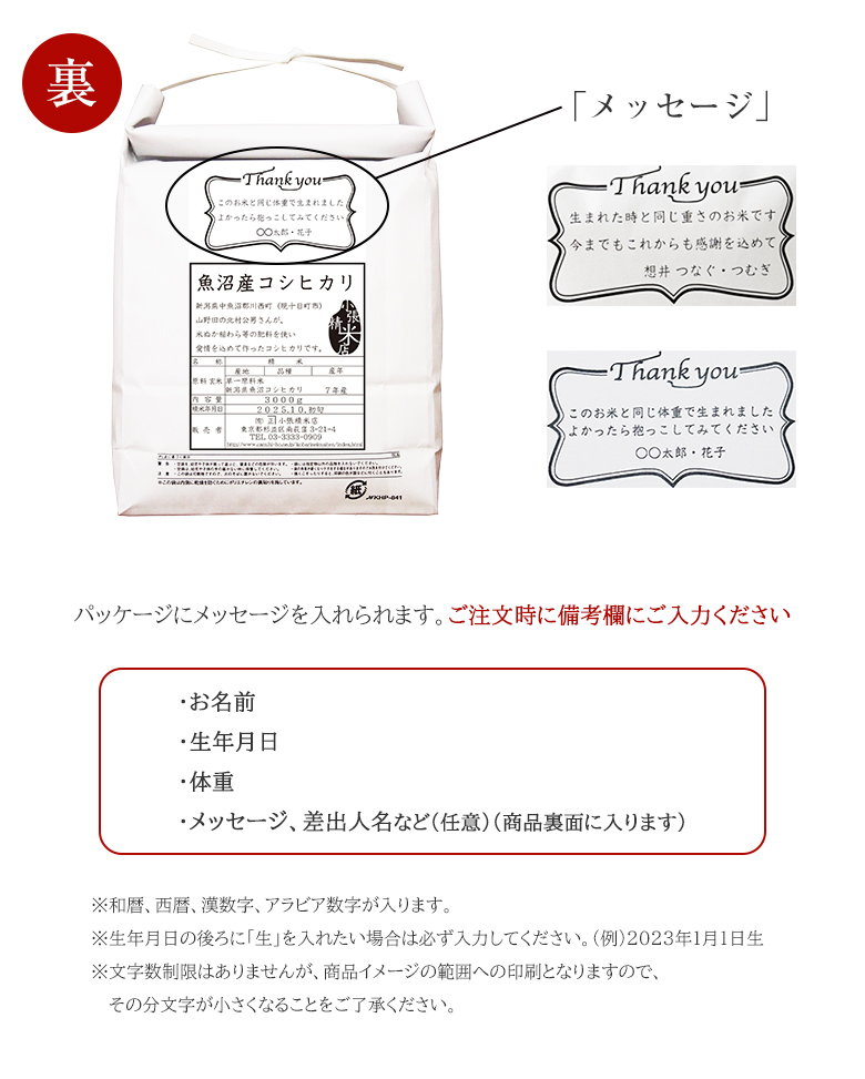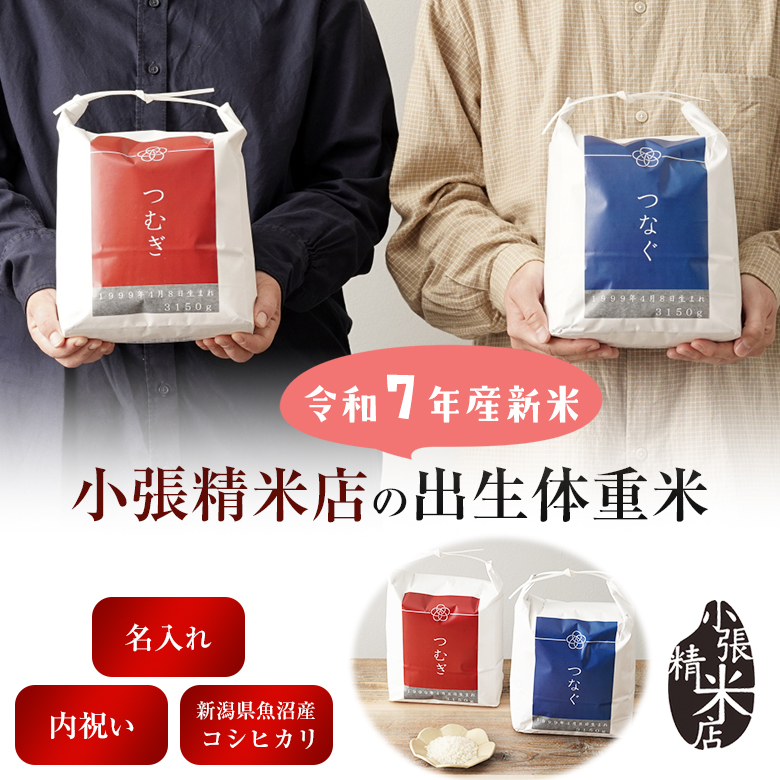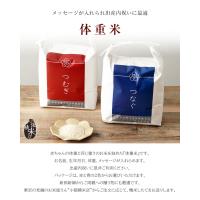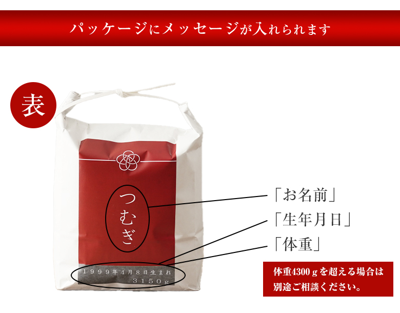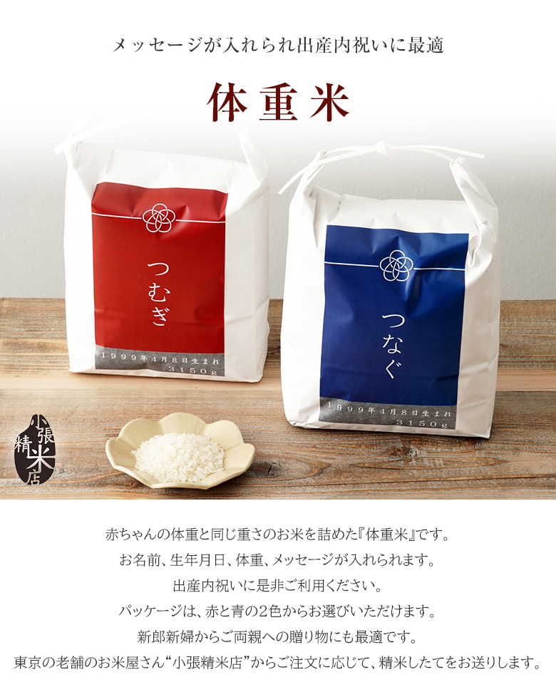 | 商品説明 | 赤ちゃんの体重と同じ重さのお米を詰めた『体重米』です。お名前、生年月日、体重、メッセージが入れられます。出産内祝いに是非ご利用ください。パッケージは、赤と青の2色からお選びいただけます。新郎新婦からご両親への贈り物にも最適です。東京の老舗のお米屋さん“小張精米店”からご注文に応じて、精米したてをお送りします。 |