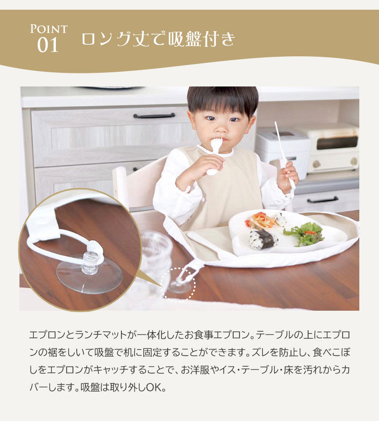 [商品説明]出産祝いとしても人気!グッドデザイン賞受賞のデザイン&多機能なデザインで使えるロングタイプのお食事エプロン。ランチマットとお食事スタイが一体化したロングデザインで、テーブルとイスのすき間に落ちていく食べこぼしをエプロンがキャッチしてくれます。食べこぼしの後片付け負担を「9割」短縮する長さ&吸盤付き!0〜3歳頃まで長く使うことができ、従来の離乳食から「BLW離乳食」まで幅広く対応が可能。選べる4つのデザインで、家の中だけではなく、お出かけの時や結婚式の時など、時や場所を問わずご使用いただけます。ママとパパが「子どもと笑顔でお食事ができるお食事エプロン」です。
