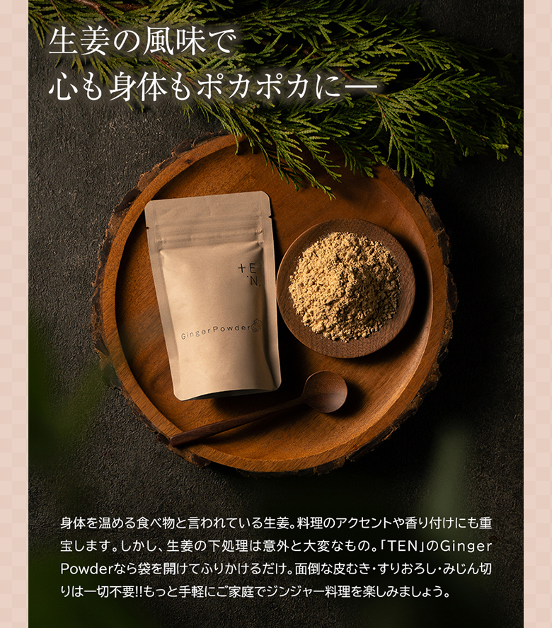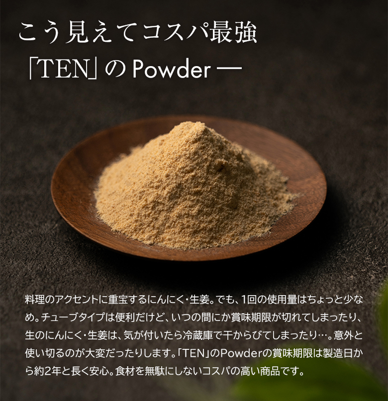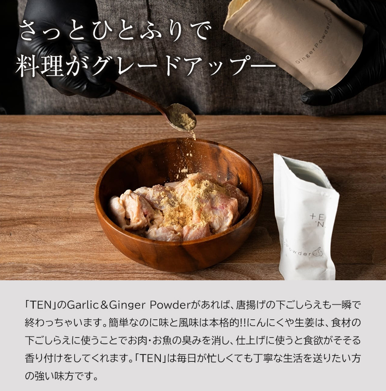 [商品説明]使いたい時に使いたい分だけ。ご好評いただいております「TEN」のPowder、ガーリックとジンジャーをセットにしてお届けします。九州産の食材本来の香りが、いつものお料理をワンランク上の美味しさにしてくれます。普段使いからギフトまで最適な商品です。添加物は一切不使用で、原材料はにんにく・生姜のみ。九州産100%のにんにく・生姜をじっくりとパウダー状に仕上げました。濃縮された香りが特徴で、袋を開けた瞬間の香りは、必ず驚いていただけると思います。本物の香りを是非お楽しみください。にんにく・生姜料理のストレスを解決し、普段のお料理をより美味しく、より便利に。皆様の食卓に感動をお届けできますと幸いです。