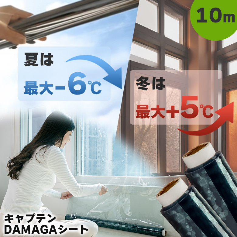 [商品説明]夏の暑さも・冬の寒さもこれ一枚! 窓用断熱シート『キャプテンDAMAGAシート』。キャプテンDAMAGAシートは、夏は熱を遮断、冷房効率をアップして涼しく。冬は冷気をシャットアウト、暖房効率アップして暖かく。電気代を節約し、一年中、室内温度を快適にサポート。寒さ・暑さ・紫外線・結露・飛散防止を実現する多機能フィルムです!こちらは10mの販売ページとなります。