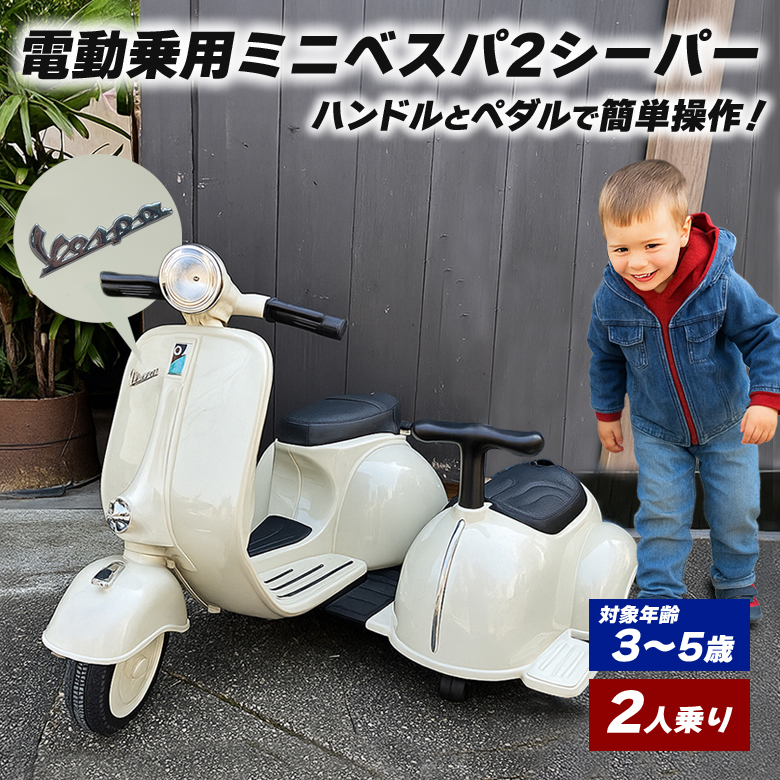 まるで本物のベスパに乗っているかのような気分が味わえるキッズ向け電動乗用パイクの希少な2人乗りモデル。ハンドルとペダルで簡単に操作が可能。おしゃれなデザインで感性と好奇心を養います。お誕生日やクリスマスなど、特別な日の贈り物に最適です。