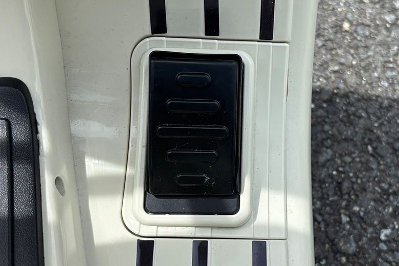左から「前進後進切り替えボタン」「クラクションと音楽」「電源ボタン」