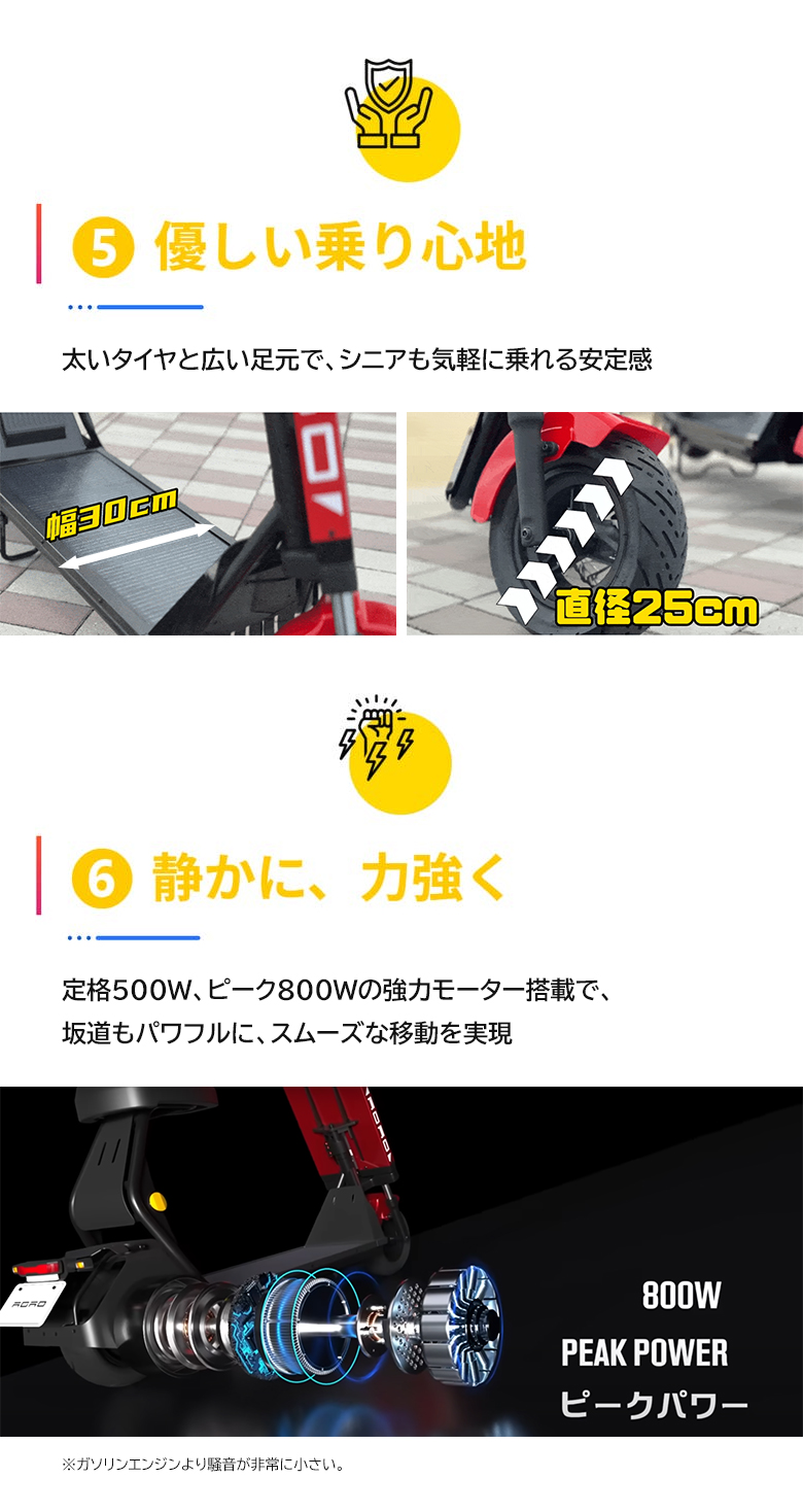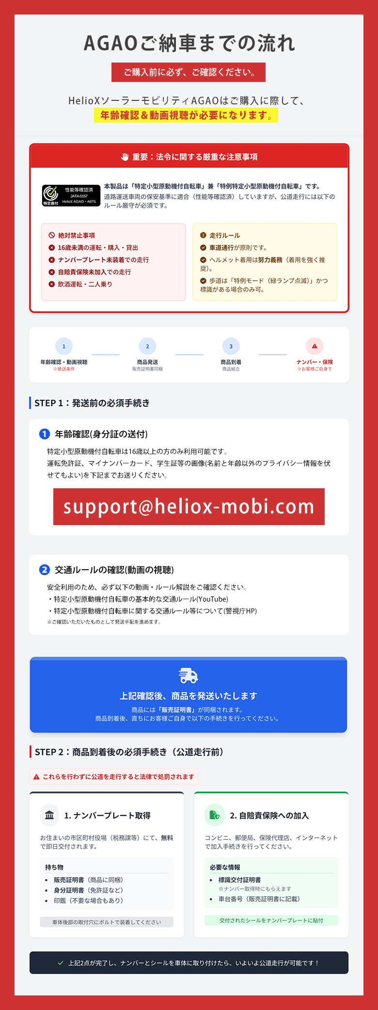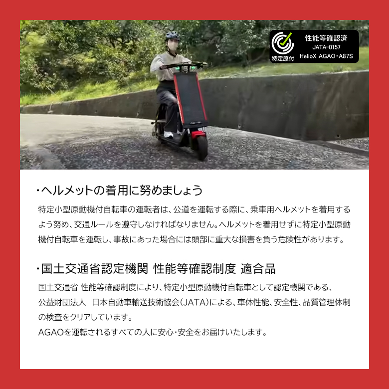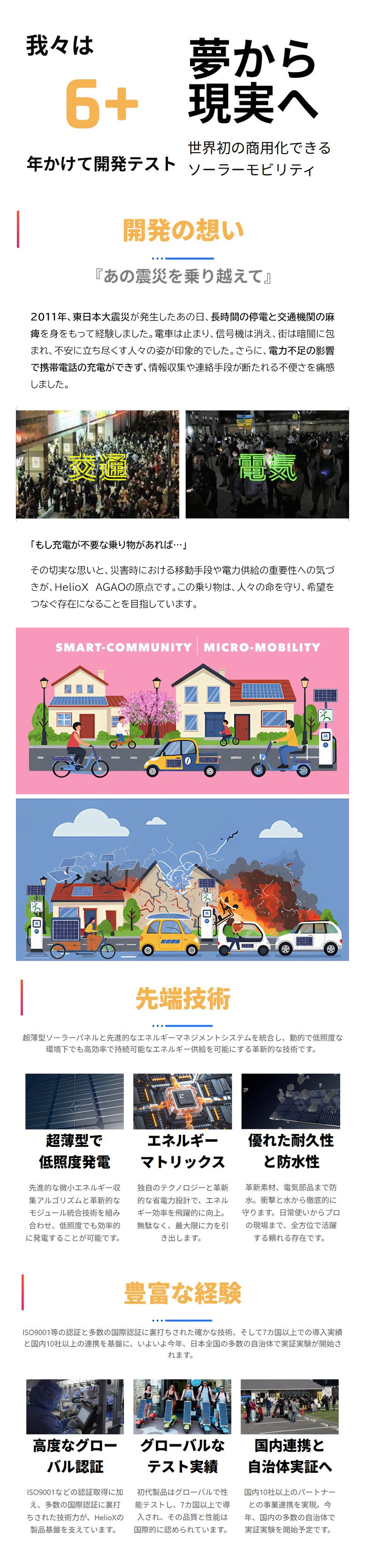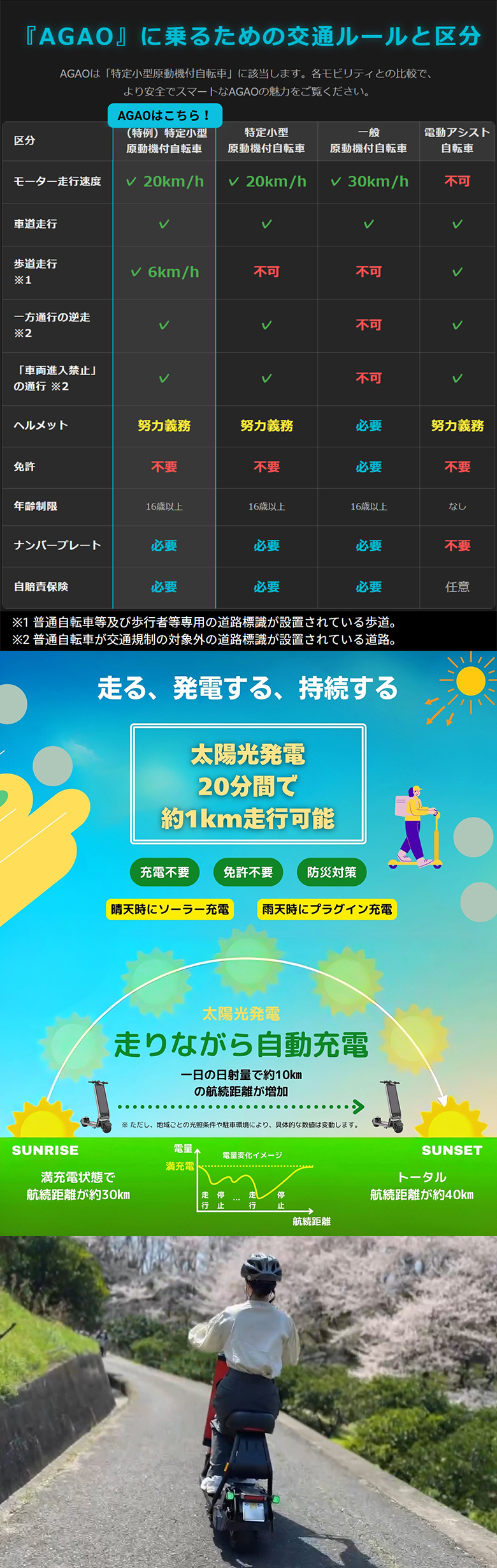 AGAOは、次世代型ソーラー駆動型マイクロモビリティとして遂に登場しました。充電の手間も電気代も不要で、太陽さえあれば自由に走行可能。日常の通勤、買い物、観光地での快適な移動から、災害時の緊急電源まで幅広く活躍します。2023年7月に新車両区分となった特定小型原動機付自転車とは、最高速度を20km/hに制限し、16歳以上であれば運転免許不要でヘルメットの着用は努力義務とされた車両区分です。さらに、AGAOは6km/hに制限して歩道走行も可能な“特例特定小型原動機付自転車”です。