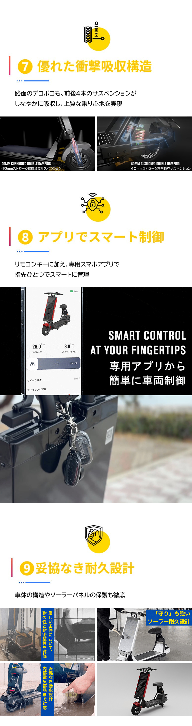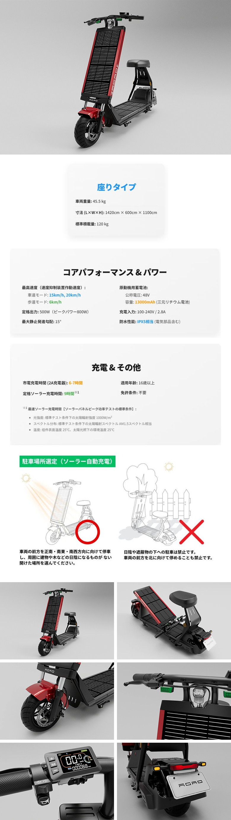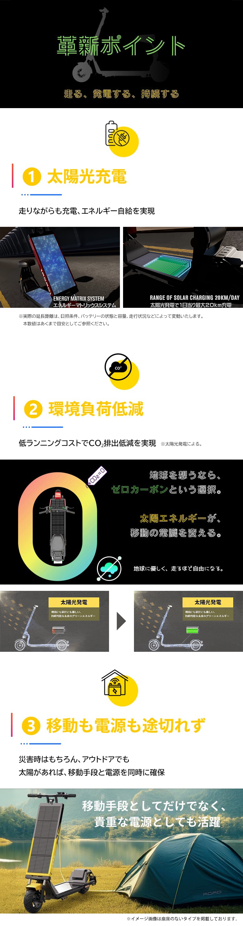 [商品説明]AGAOは、次世代型ソーラー駆動型マイクロモビリティとして遂に登場しました。充電の手間も電気代も不要で、太陽さえあれば自由に走行可能。日常の通勤、買い物、観光地での快適な移動から、災害時の緊急電源まで幅広く活躍します。