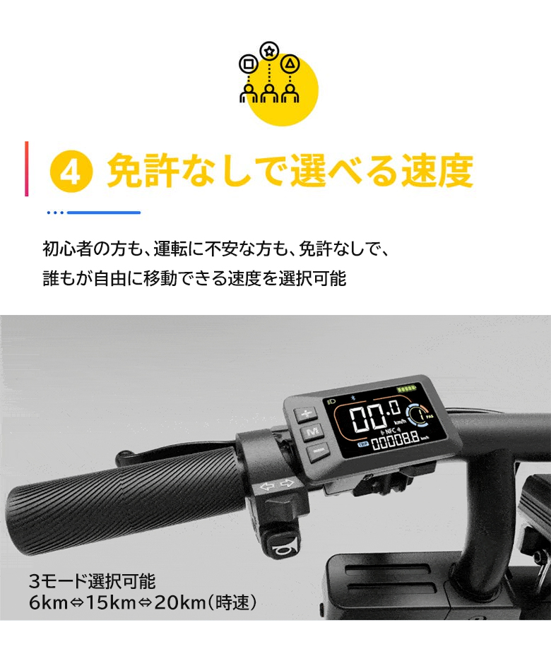 [最高速度(速度抑制装置作動速度)]車道モード:15km/h,20km/h、歩道モード:6km/h