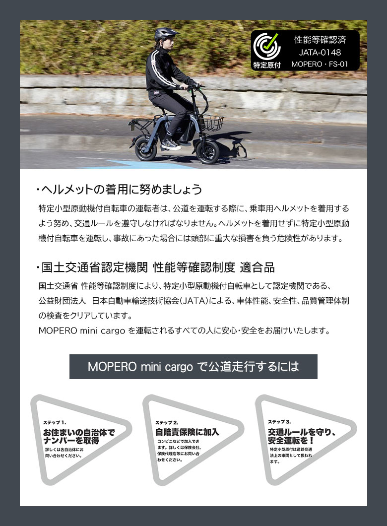 [商品説明]MOPERO mini cargoは、公道を走行できる「免許不要」の電動モビリティ。16歳以上であれば誰でも乗れるから、家族でのシェアも簡単です。フル電動&ペダルレス、坂道でも漕ぐ必要がなく、疲れ知らずで快適に移動できます。ペットと一緒に乗ることができ、ちょっと遠くまでのお散歩や、老犬・シニア犬の通院などにとっても便利。高い耐久性と安定性で、安心してご使用いただけます。