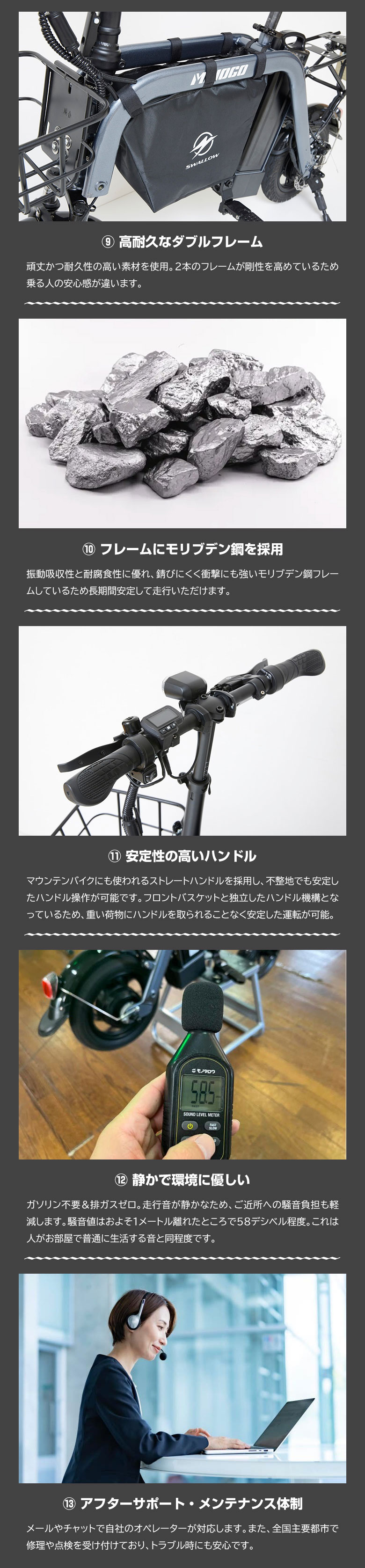 モリブデン合金を使用した衝撃や振動に強い設計で、段差のある道でもしっかり走行。衝撃や振動に強い設計で、段差のある道でもしっかり安定。耐久性を重視して長く使えるよう開発されています。