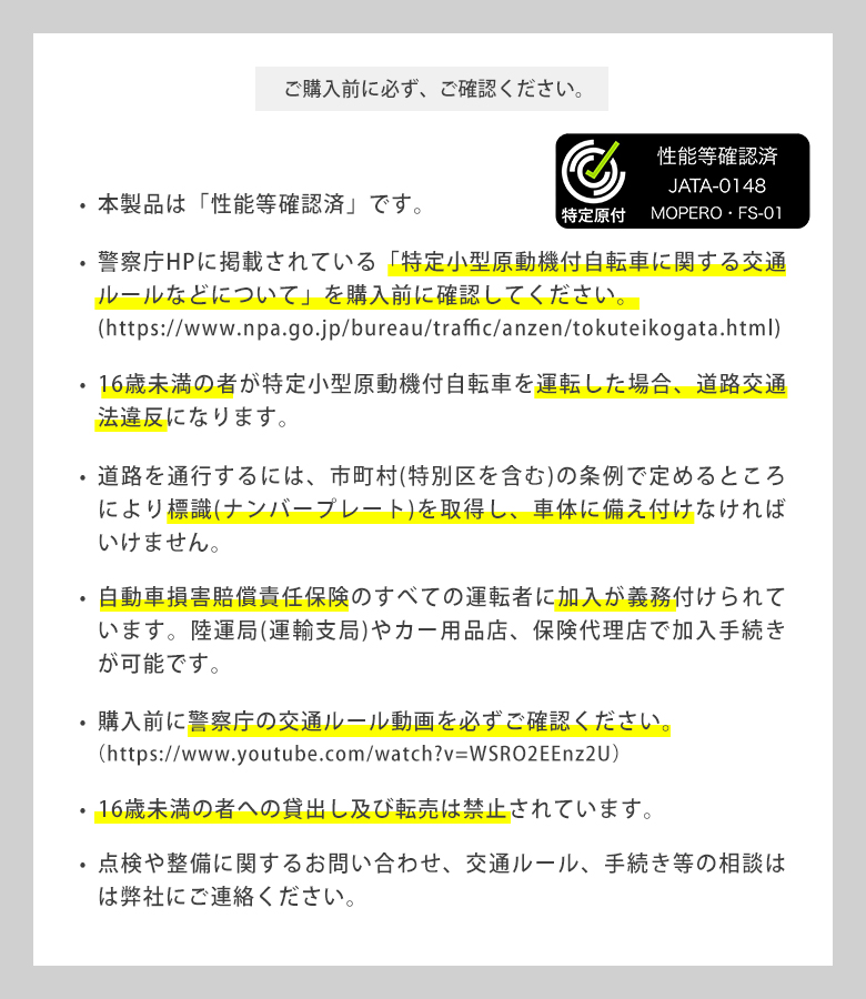 [ヘルメット着用について]特定小型原動機付自転車として公道を運転する際には道路交通法により、乗車用ヘルメットの着用が努力義務とされています。 ヘルメットを着用せずに特定小型原動機付自転車を運転し、事故にあった場合には頭部に重大な傷害を負う危険性があります。