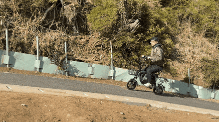 ペダルのない自転車型のモビリティでフル電動駆動。坂道でも漕ぐ必要がなく、疲れ知らずで快適に移動できます。