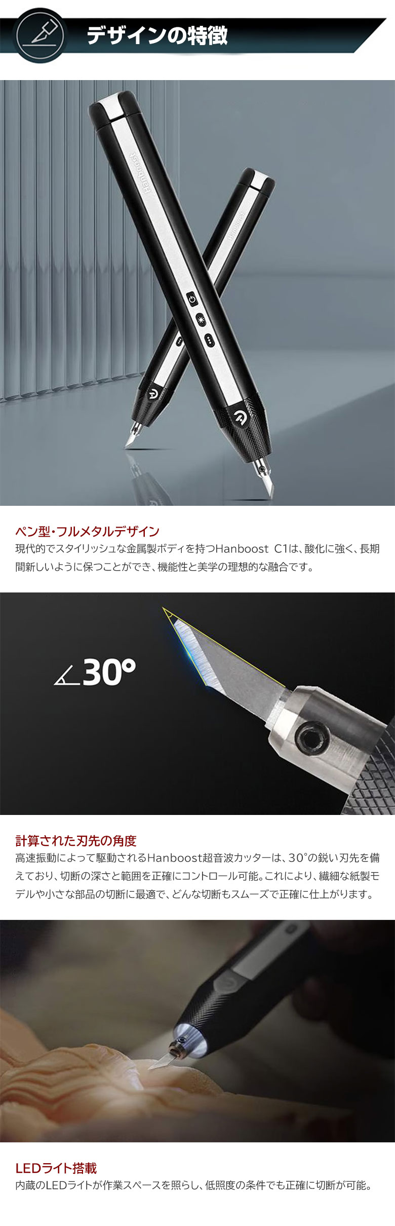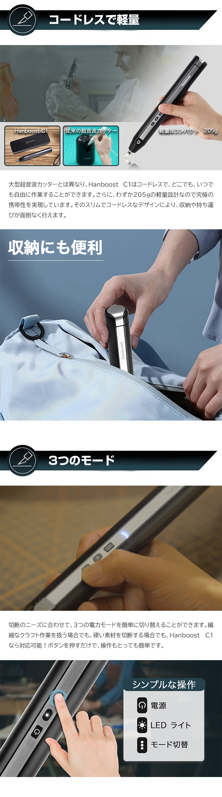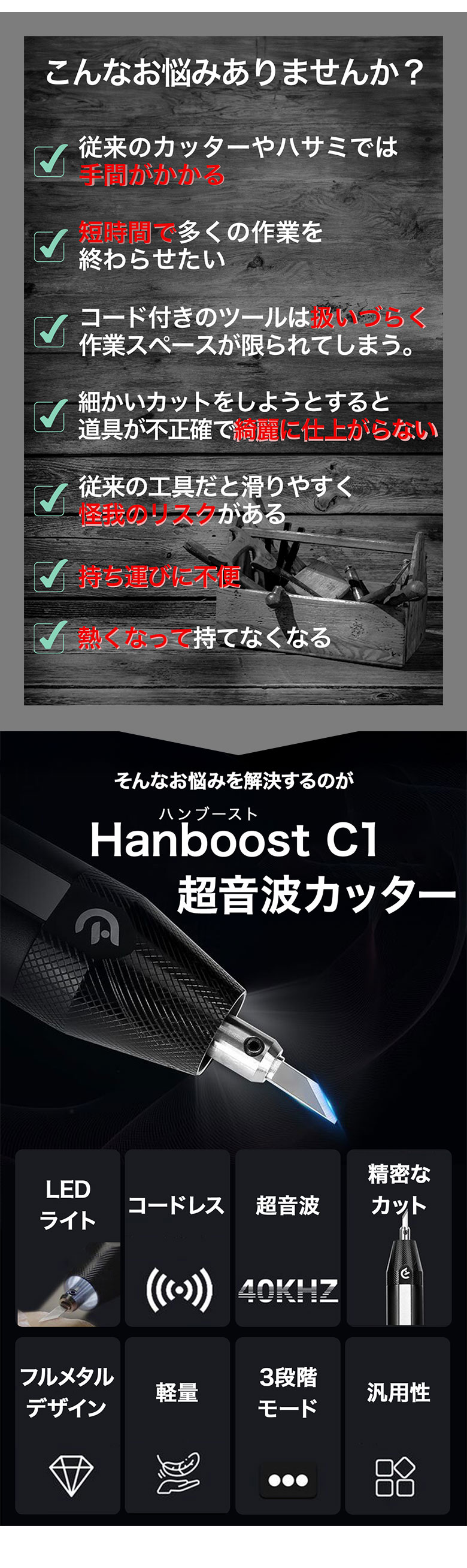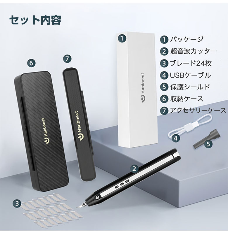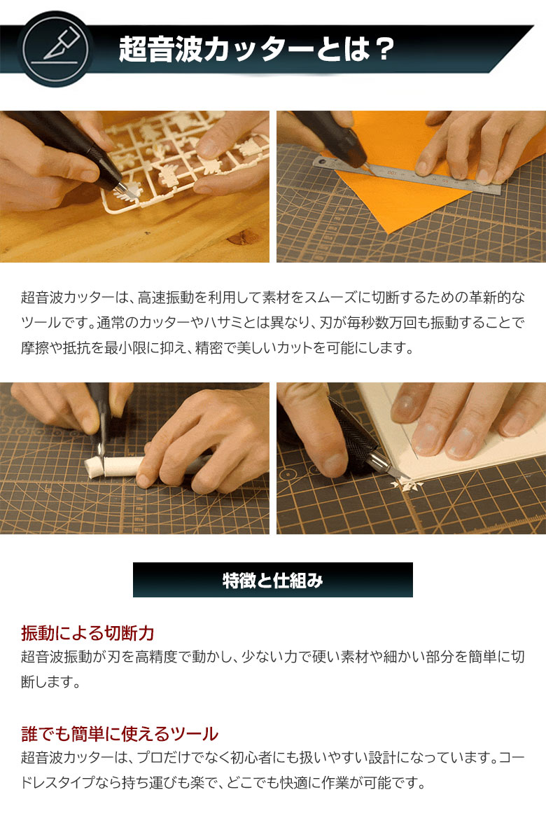 [商品説明]毎秒40,000回振動!ブレないコードレス超音波カッター「HANBOOST CUTTER C1」。コンパクトで軽量。コードレスだから、どこでも使いやすい超音波カッター。プラモデルから石膏まで、幅広い素材に対応。時間短縮で作業効率UP間違いなし!