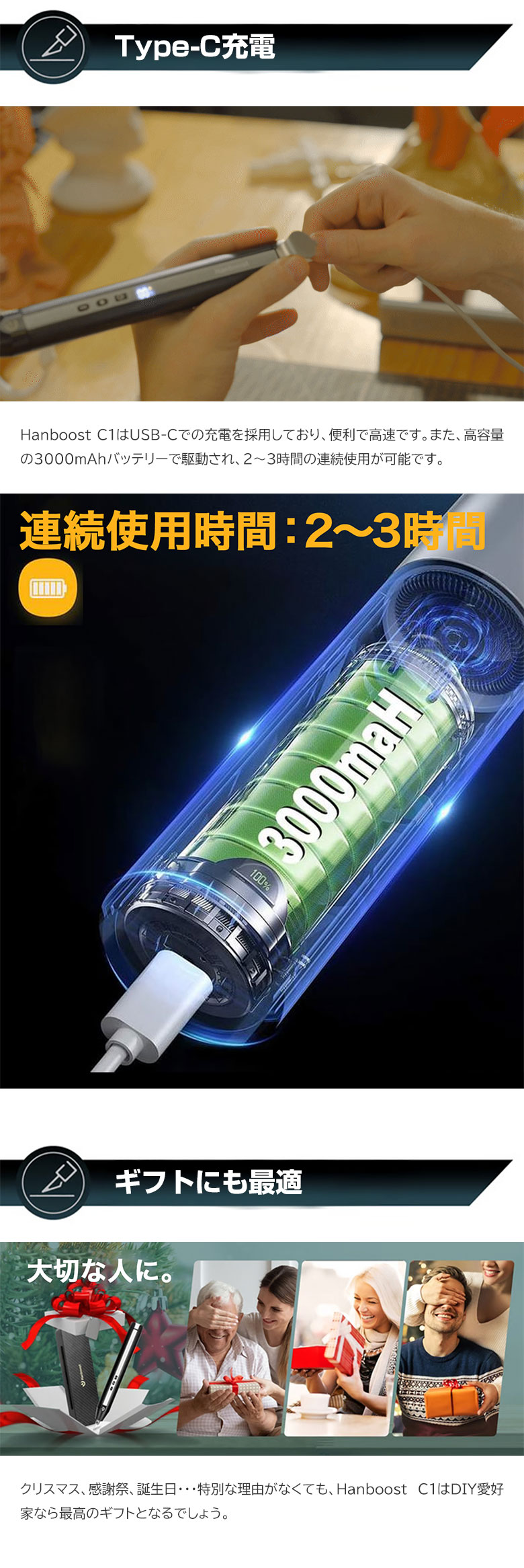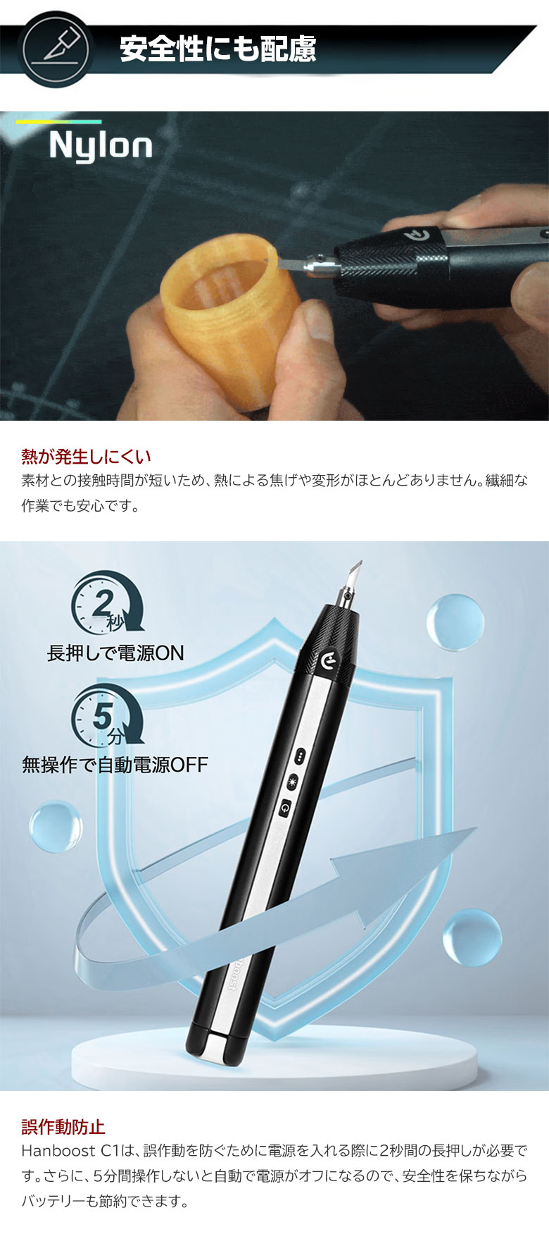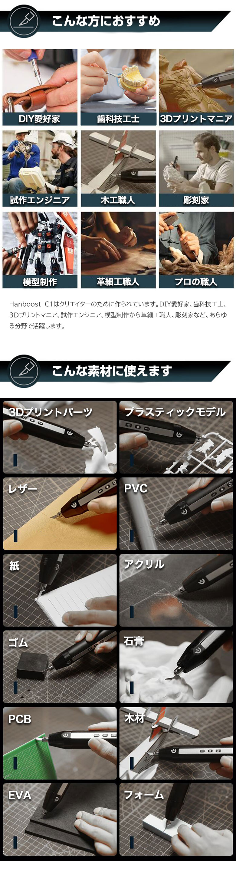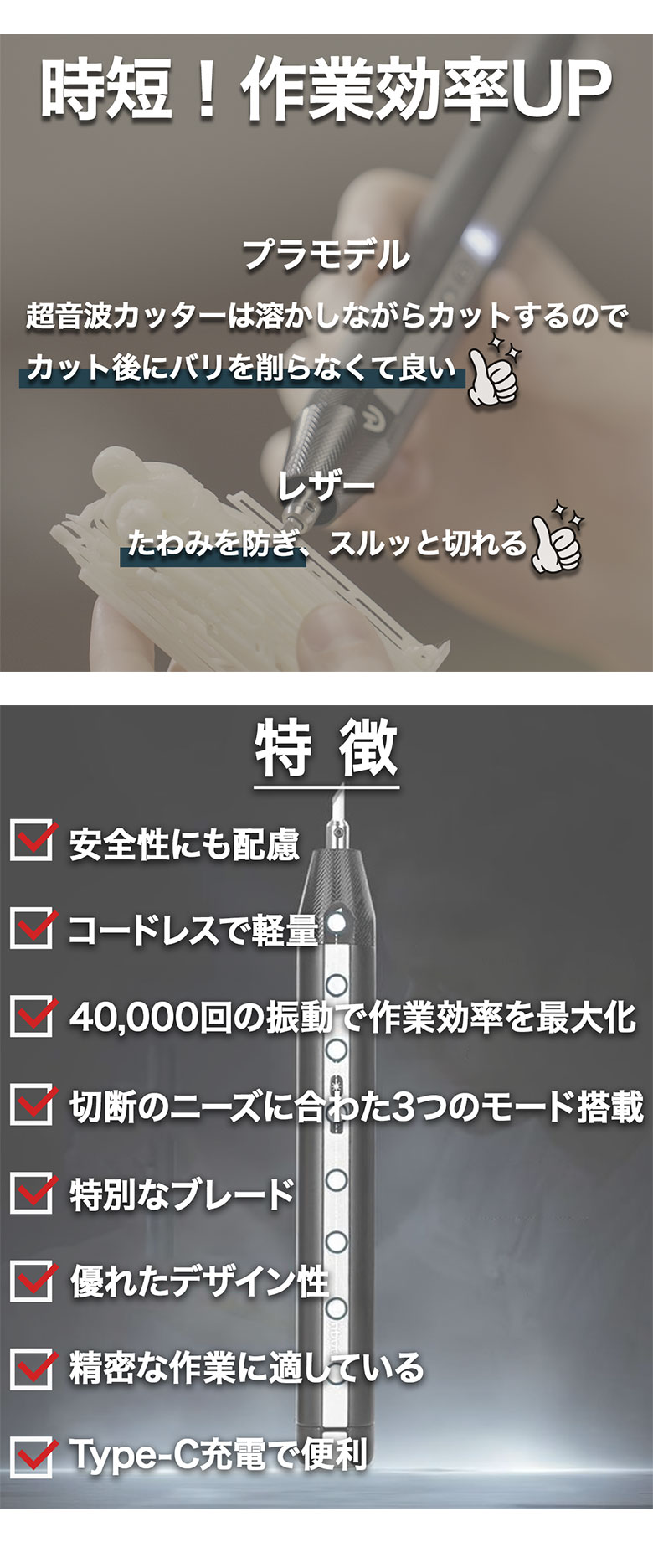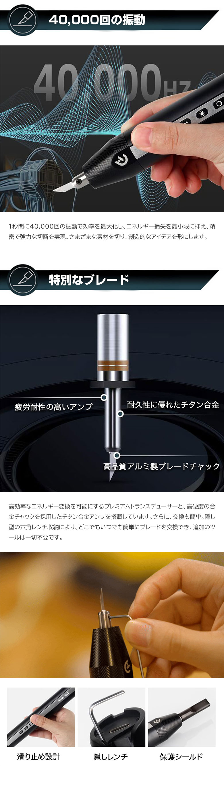 [商品説明]毎秒40,000回振動!ブレないコードレス超音波カッター「HANBOOST CUTTER C1」。コンパクトで軽量。コードレスだから、どこでも使いやすい超音波カッター。プラモデルから石膏まで、幅広い素材に対応。時間短縮で作業効率UP間違いなし!