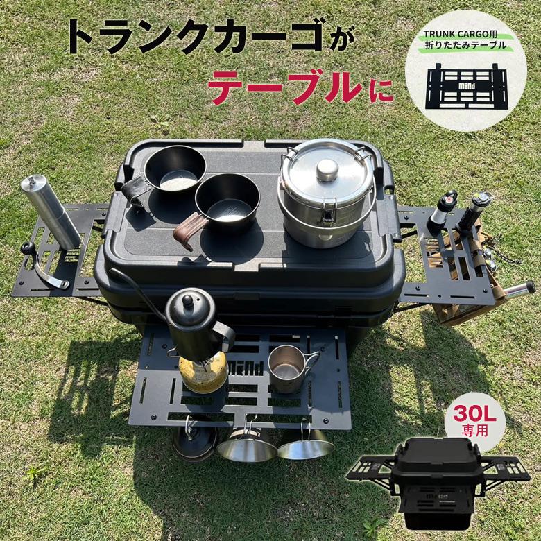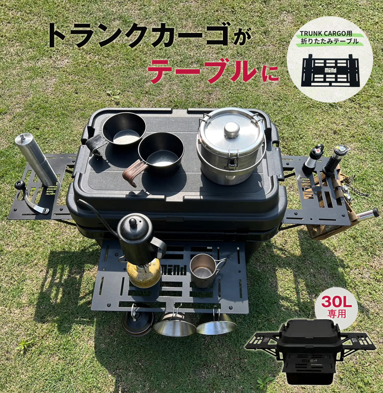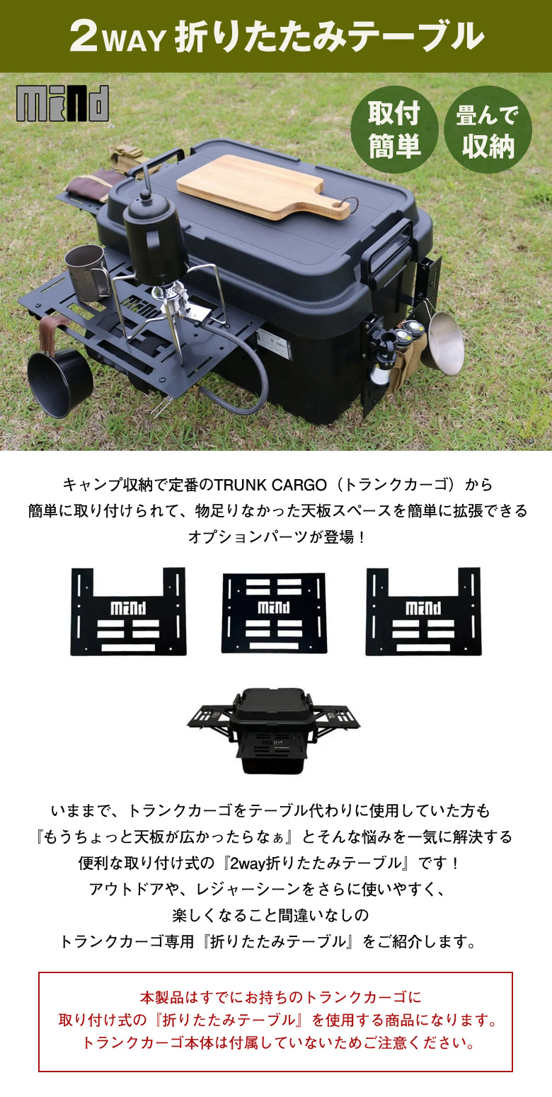 | ご注意 | ※本製品はすでにお持ちのトランクカーゴに取り付ける式の『折りたたみテーブル』を使用する商品になります。 トランクカーゴ本体は付属していないためご注意ください。 ※金属製品のため、擦れなどにより若干塗装が剥がれる場合がございます。 |