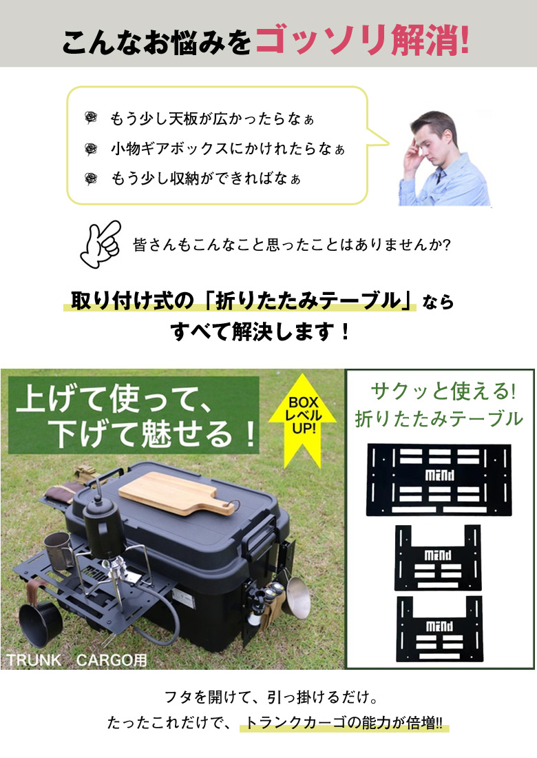 | 商品説明 | キャンプ収納で定番のTRUNK CARGO(トランクカーゴ)は持ち運びやすさに加え、収納性、さらに家でもキャンプでもマルチに使えるおしゃれさも兼ね備えています。 ・もうちょっと天板が広かったらなぁ ・ギアをかけたりしたいなぁ ・収納力増やしたいなぁ こんな悩みをお持ちの方に取り付け式の『2way折りたたみテーブル』が解消します!! 物足りなかった天板スペースを簡単に拡張!使わない時は折りたたんで見せる収納として使える! 「いちいち取り外しが面倒なのでは?」と思われた方もいるでしょう。 大丈夫です! 取り付けた状態で蓋のロックができるんです。 普段からつけた状態で保管することができるので 片付けは不要になります。 |