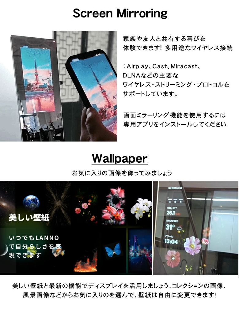 | 商品説明 | あなたの生活を便利にするデジタルミラーです。豊富なコンテンツと機能で暮らしをお手伝いします。契約縛りがなし月額料金なし! 24時間365日トレーニング見放題!Android9搭載,高輝度 32インチタッチパネル、15Wスピーカー、LED夜間ライト..etc ホーム画面から天気やニュースなどの情報を気軽にチェックできるのはもちろん、、株価情報、グループチャット、SNS、IoT、見守り、アラーム、写真、そして人気のフィットネスレッスンなど、豊富かつ多彩なMINI APPをお楽しみいただくことも可能です。 |
